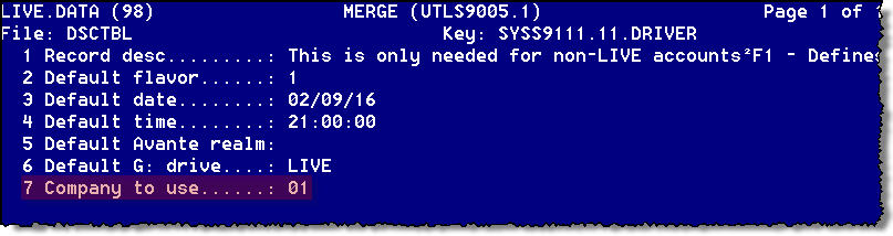 Change DSCTBL SYSS9111.11.DRIVER F7 to match the company you wish to process: