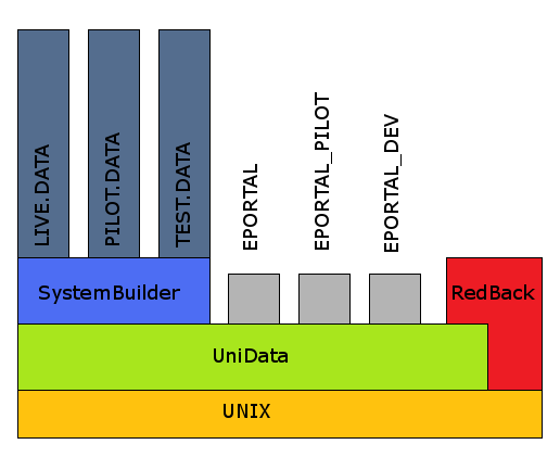 All the software runs on HPUX (HP's flavor of UNIX). The Epicor software is stored in different directories and files based on the type of data - programs and DICTs are in one area while the true data is in another. These are further sub-divided into three stages of development (dev, pilot & live). Keeping the programs and DICTs separate from the data allows us to have multiple data accounts share the same programs/DICTs. It also allows us to easily refresh testing environments from the live environment without losing our program changes (though data changes would be lost). We do these "data refreshes" semi-regularly.