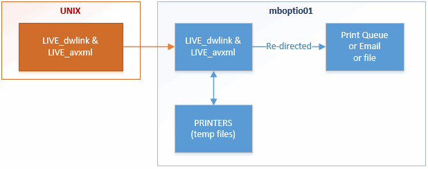 When an option job is sent to the UNIX print queue, it is passed to its twin queue on the mboptio01 box. This process builds a pair of temp files in the C:\WINDOWS\system32\spool\PRINTERS folder on the mboptio01 box. Optio then processes this pair of temp files and sends the results to either the desired Windows print queue/printer, an Email or saves as a file to disk.