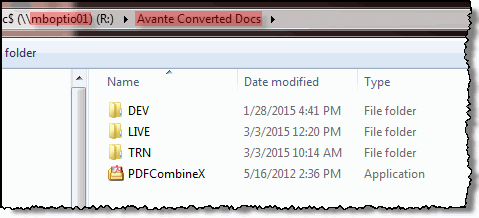 This is a temperary folder in the mboptio01 Windows spooler. Double-click to see what is currently in this temp folder. For each job submitted from UNIX to Optio, there will be a pair of files. Note that files should be processed and deleted at a fairly fast rate, so generallt speaking, there should not be anything older than a minute or so.