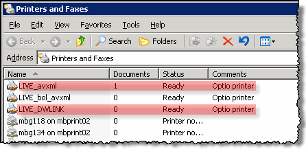 If the Optio print server is down, jobs get stuck in PRINTERS.If print jobs are stuck in the mboptio01 ..\spool\PRINTERS folder, it could be because the printer is off-line - not an "optio" issue.