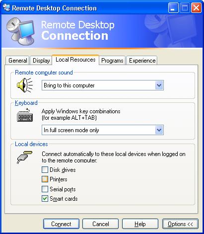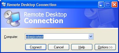 From the Start --> Run menu, enter "mstsc".Enter the name of the server (mboptio, mbepicor, mbepicortest), then click on the options button.